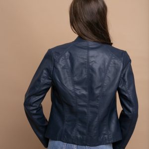 Μπλε Κοντό Μπουφάν Δερματίνη με Φερμουάρ