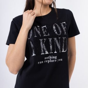 Μαύρο Κοντομάνικο Μπλουζάκι με Τύπωμα “One of a Kind” & Δαντέλα