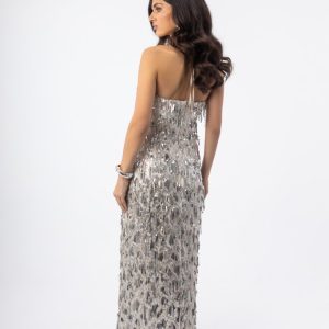 Γυναικείο Maxi Φόρεμα Ασημί διακοσμημένο με παγιέτες & κρόσσια