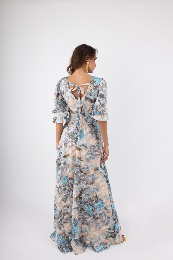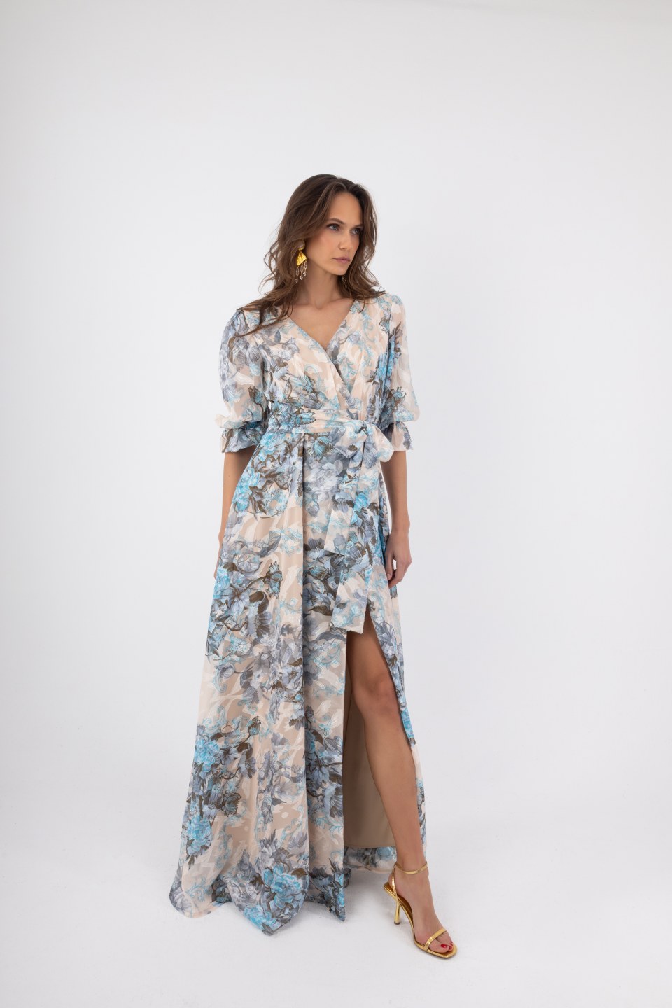 Γυναικείο Κρουαζέ Maxi Φόρεμα Εκρού με Γαλάζιο και φλοράλ σχέδια