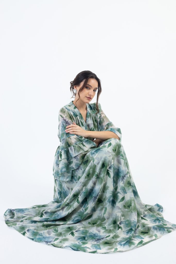 Αέρινο και ιδιαίτερα κομψό, αυτό το maxi φόρεμα σε πράσινες και σιελ αποχρώσεις με υδατογραφικό φλοράλ σχέδιο αποπνέει ρομαντισμό και φυσική φρεσκάδα. Η απαλή βάση συνδυάζεται αρμονικά με τις διαβαθμίσεις του πράσινου, δημιουργώντας ένα αποτέλεσμα που θυμίζει καλοκαιρινό τοπίο.