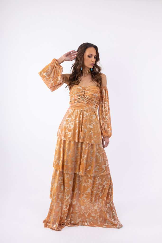 ο Γυναικείο Maxi Φόρεμα Πορτοκαλί με Glitter, Off Shoulder Μανίκια & Λεπτές Τιράντες ξεχωρίζει για την εκλεπτυσμένη του αισθητική και τη διακριτική λάμψη που χαρίζει η glitter υφή του υφάσματος. Η απαλή απόχρωση μπεζ–χρυσό σε συνδυασμό με το αέρινο φλοράλ μοτίβο δημιουργεί ένα κομψό αποτέλεσμα με κίνηση και φινέτσα, ιδανικό για ξεχωριστές περιστάσεις.
