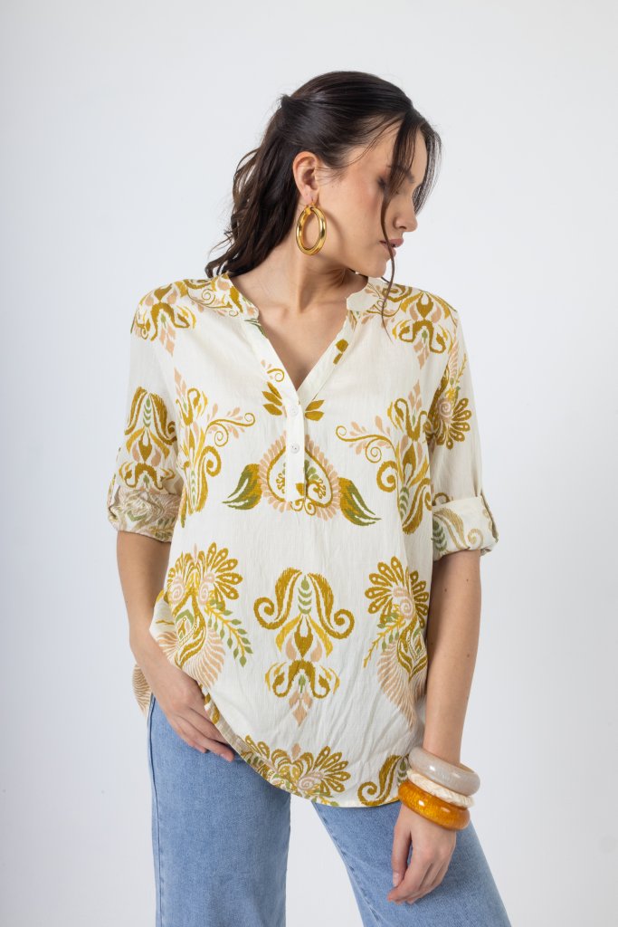 Αέρινο και κομψό πουκάμισο σε εκρού βάση με ιδιαίτερο χρυσό μοτίβο που αποπνέει κομψότητα και διακριτική πολυτέλεια. Το print του δίνει μια ethnic–inspired αισθητική, ενώ η χαλαρή του γραμμή προσφέρει άνεση και φυσική κίνηση.