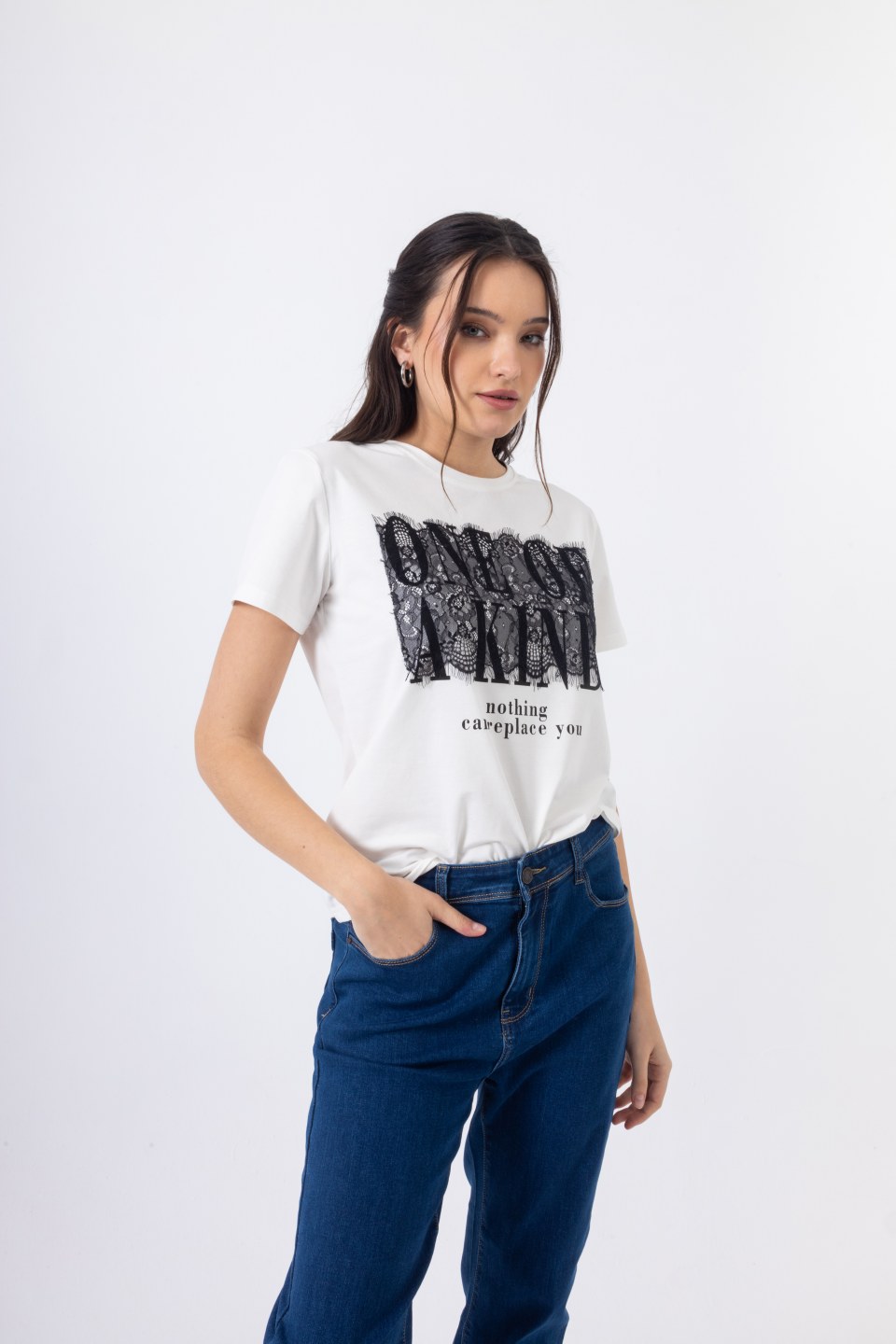 Statement λευκό t-shirt που ξεχωρίζει για το ιδιαίτερο τύπωμα με τη φράση “One of a Kind”, αναδεικνύοντας τη μοναδικότητα και το προσωπικό σου στυλ. Ο συνδυασμός του print με διακριτικές δαντελένιες λεπτομέρειες προσθέτει θηλυκότητα και fashion χαρακτήρα, δημιουργώντας ένα κομμάτι που δεν περνά απαρατήρητο.