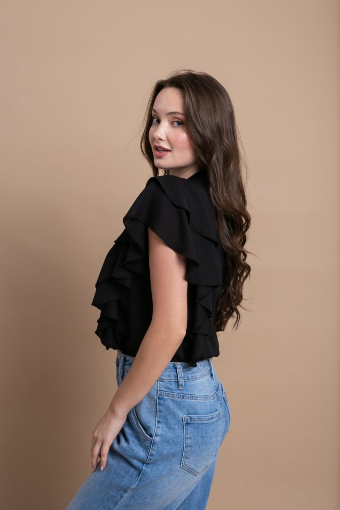 Μοντέρνο και διαχρονικό μαύρο πουκάμισο που αποπνέει κομψότητα και διαχρονική θηλυκότητα. Η απαλή, ρευστή υφή του υφάσματος χαρίζει αέρινη κίνηση, ενώ τα διακριτικά βολάν κατά μήκος του μπροστινού μέρους προσθέτουν χαρακτήρα και εκλεπτυσμένη λεπτομέρεια.
