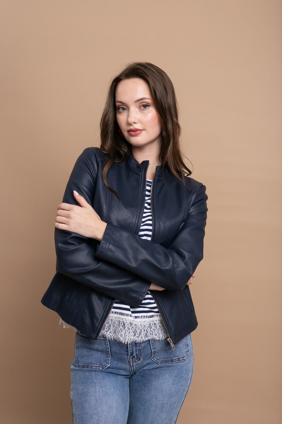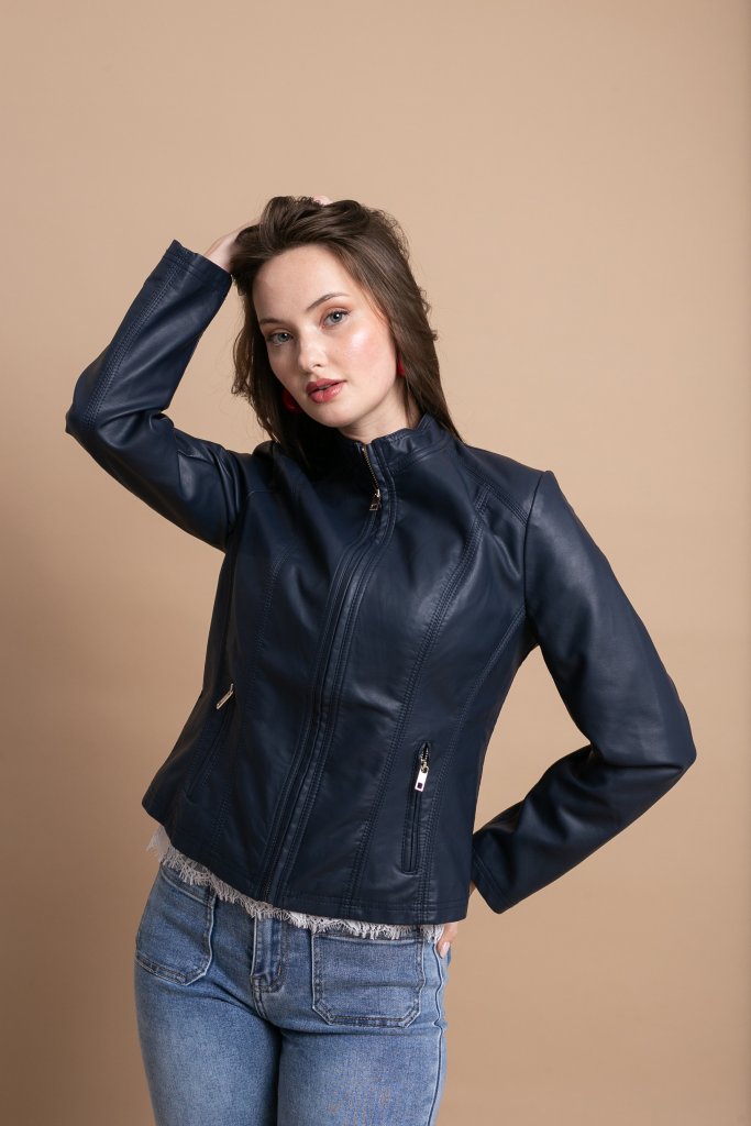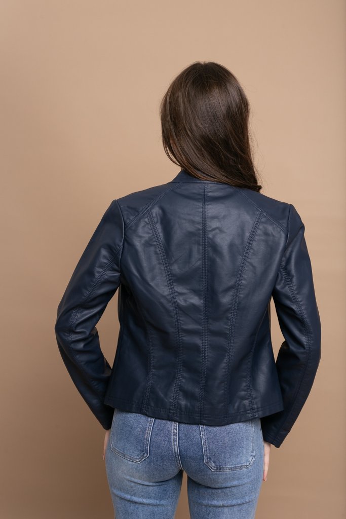 Μοντέρνο και δυναμικό μπλε μπουφάν δερματίνη που απογειώνει κάθε εμφάνιση με τον διαχρονικό του χαρακτήρα. Το λειτουργικό φερμουάρ στο μπροστινό μέρος εξασφαλίζει πρακτικότητα, ενώ παράλληλα λειτουργεί και ως διακοσμητικό στοιχείο, ενισχύοντας το edgy και σύγχρονο ύφος του.