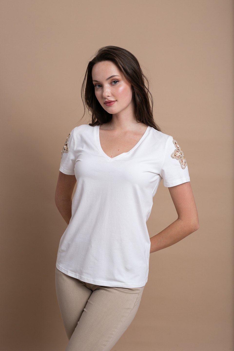 Μπλούζα Λευκή με V Λαιμόκοψη & Διακοσμητικό Σχέδιο στον Ώμο