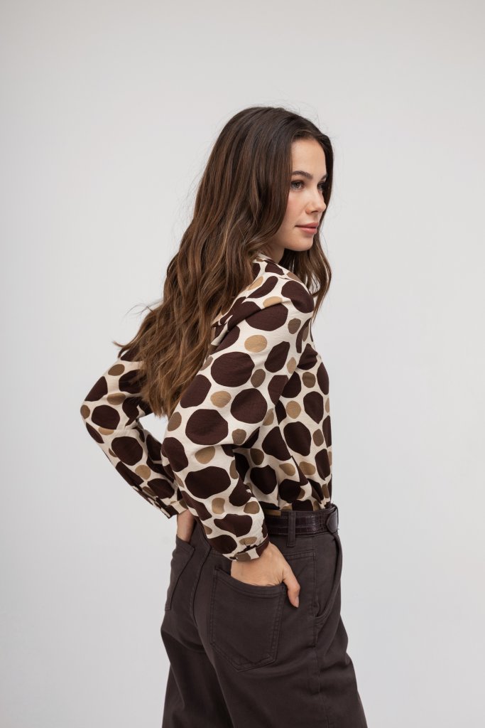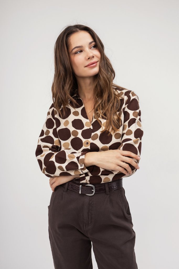 Πουκάμισο μπεζ με καφέ κυκλικά σχέδια για γυναίκες που αγαπούν τις κομψές εμφανίσεις. Μοντέρνος σχεδιασμός, άνετη εφαρμογή και κλείσιμο με κουμπιά.