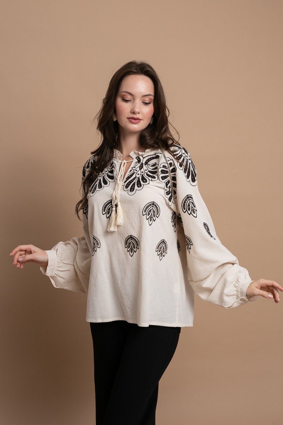 Αέρινη γυναικεία μπλούζα σε εκρού απόχρωση που συνδυάζει άνεση και διαχρονικό στυλ με έντονες boho επιρροές. Το ιδιαίτερο έθνικ κέντημα στο επάνω μέρος δημιουργεί ένα εντυπωσιακό αποτέλεσμα, προσθέτοντας χαρακτήρα και μοναδικότητα στο σχέδιο χωρίς να χάνει την κομψότητά του. Η χαλαρή γραμμή της αγκαλιάζει απαλά το σώμα, προσφέροντας ελευθερία κινήσεων και ευχάριστη αίσθηση καθ’ όλη τη διάρκεια της ημέρας.