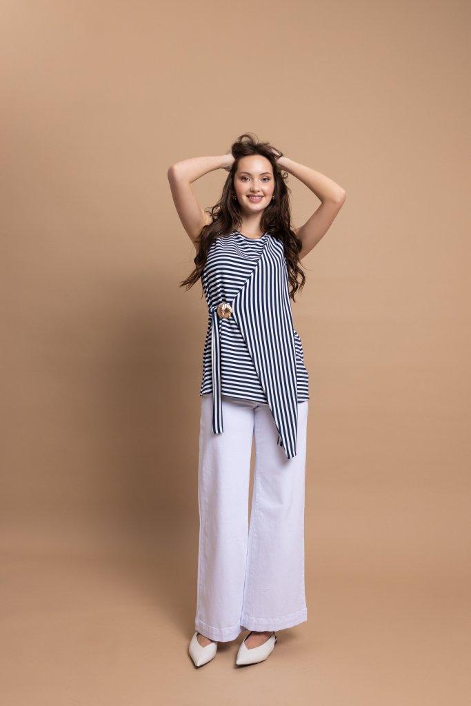 Ευκολοφόρετη γυναικεία μπλούζα με ριγέ μοτίβο που συνδυάζει διαχρονικό στυλ με σύγχρονες σχεδιαστικές λεπτομέρειες. Η ιδιαίτερη ασύμμετρη γραμμή της δημιουργεί ένα εντυπωσιακό layering εφέ στο μπροστινό μέρος, χαρίζοντας κίνηση και μοναδικότητα σε κάθε εμφάνιση. Οι κάθετες και οριζόντιες ρίγες εναλλάσσονται αρμονικά, προσθέτοντας δυναμισμό στο σχέδιο, ενώ η διακοσμητική αγκράφα στο πλάι αναδεικνύει τη σιλουέτα με διακριτικό αλλά κομψό τρόπο.