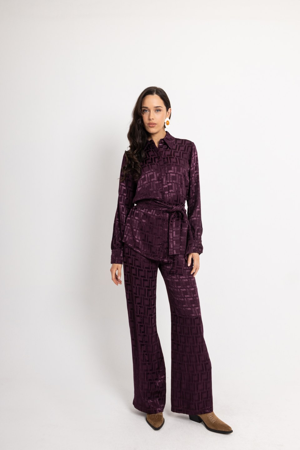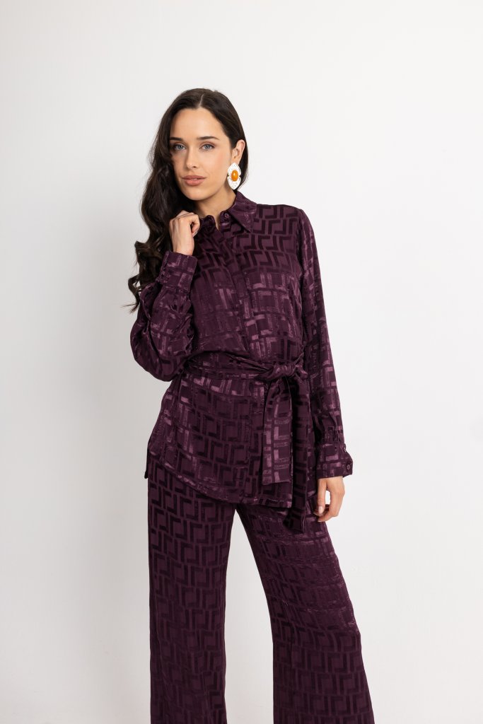 Σετ με πουκάμισο και παντελόνα σε σκούρο μώβ χρώμα. Διαθέτει διακριτικά βελουτέ γεωμετρικά σχέδια σε όλο το μήκος του. Αναβαθμίστε τη χειμερινή σας συλλογή με αυτή τη κομψή δημιουργία και χαρίστε στον εαυτό σας στιλ και άνεση.