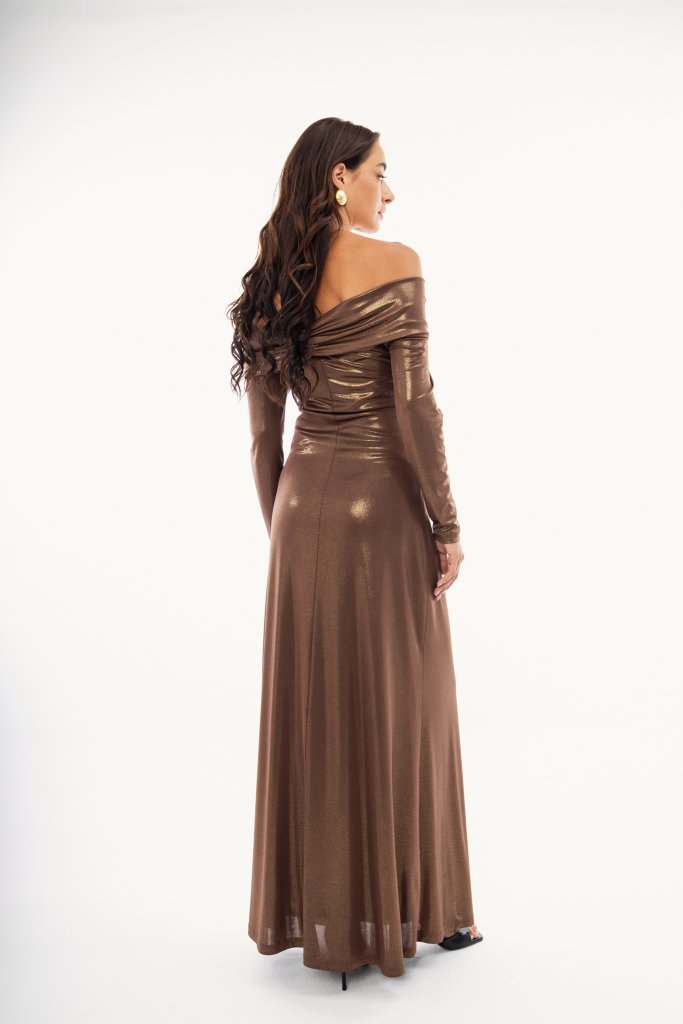 Maxi φόρεμα μεταλιζέ σε εκάι χρώμα με ιδιαίτερη λαιμόκοψη και δέσιμο στο μπούστο.