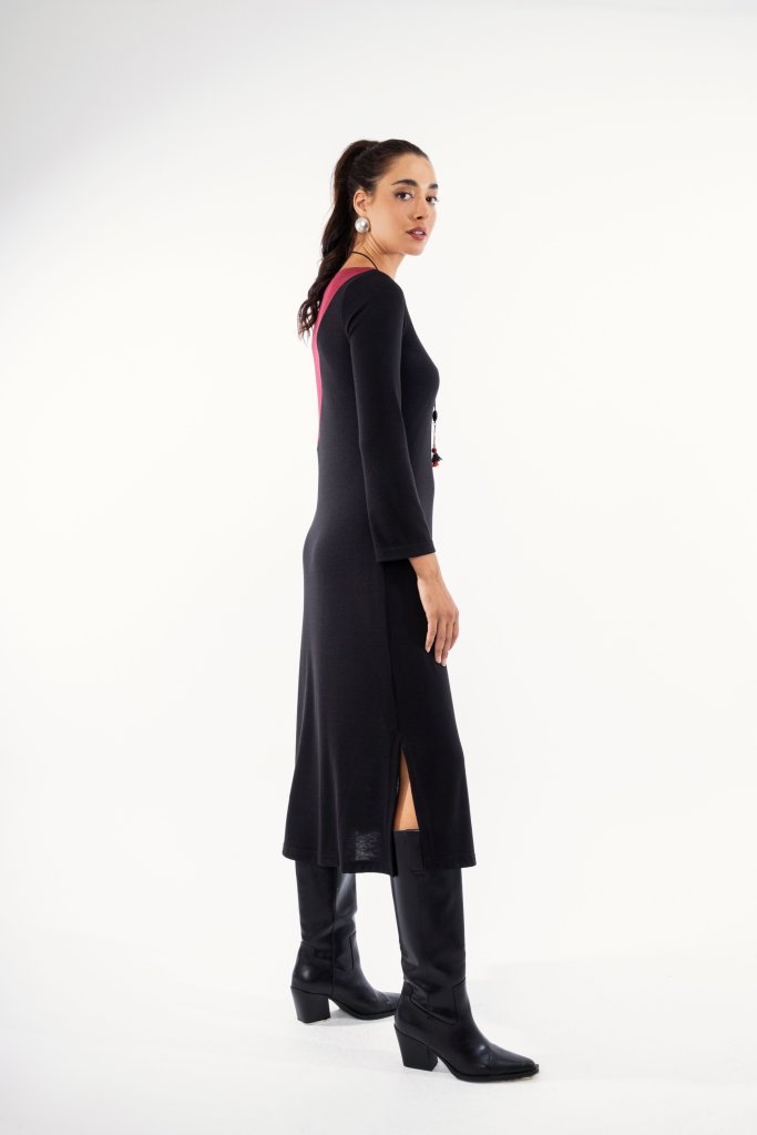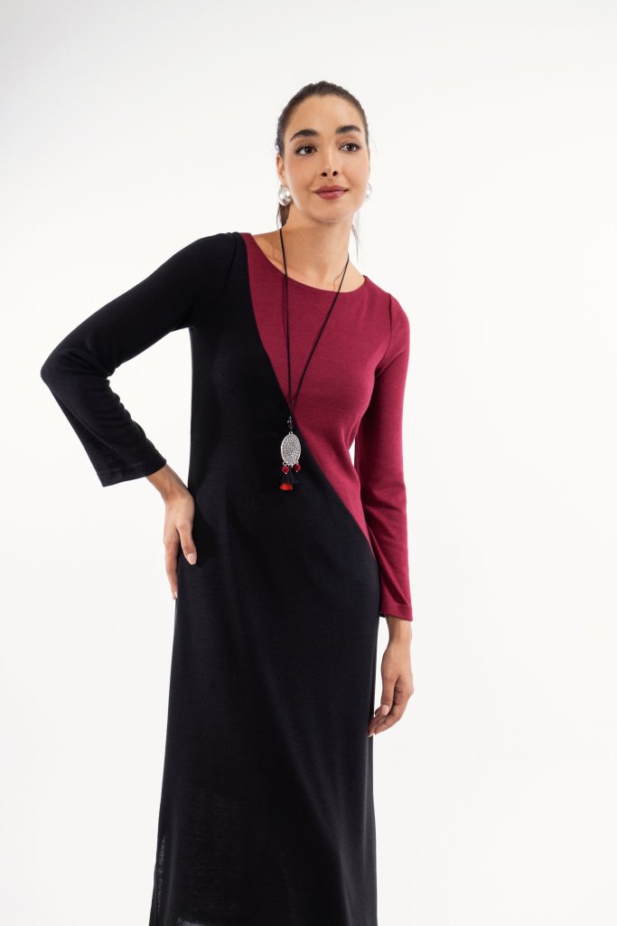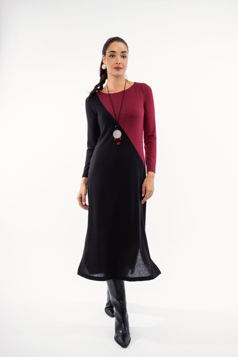 Φόρεμα μπορντό midi με δίχρωμο σχέδιο