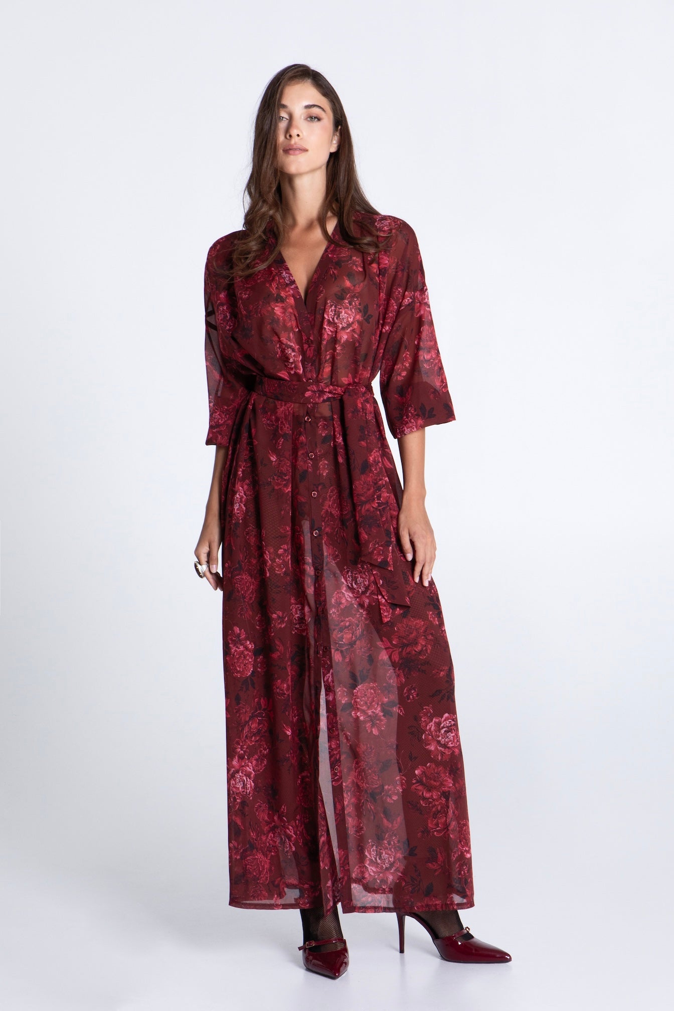 α εντυπωσιακό κομμάτι που αποπνέει διακριτική πολυτέλεια. Το Amarose Shirtdress της Eveleya, με έντονο κόκκινο floral μοτίβο και αέρινη διάφανη υφή, μπορεί να φορεθεί είτε κλειστό ως φόρεμα είτε ανοιχτό σαν κιμονό για layered εμφανίσεις. Η χαλαρή του γραμμή το καθιστά ιδανικό για κάθε σωματότυπο.