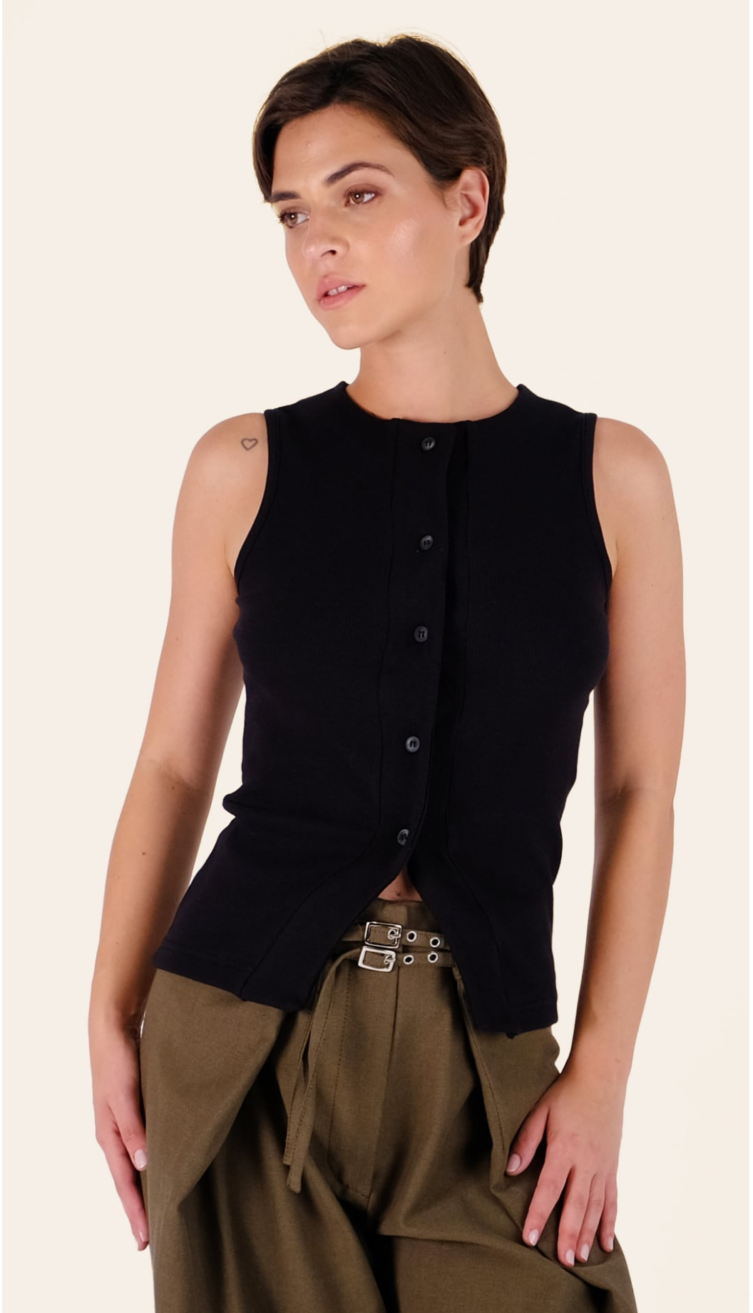 Το Anais είναι ένα αμάνικο γιλέκο σε rib ύφασμα, που συνδυάζει απλότητα και δυναμικό χαρακτήρα. Με εφαρμοστή γραμμή και κουμπιά μπροστά, προσφέρει μια κομψή αλλά και χαλαρή αισθητική.