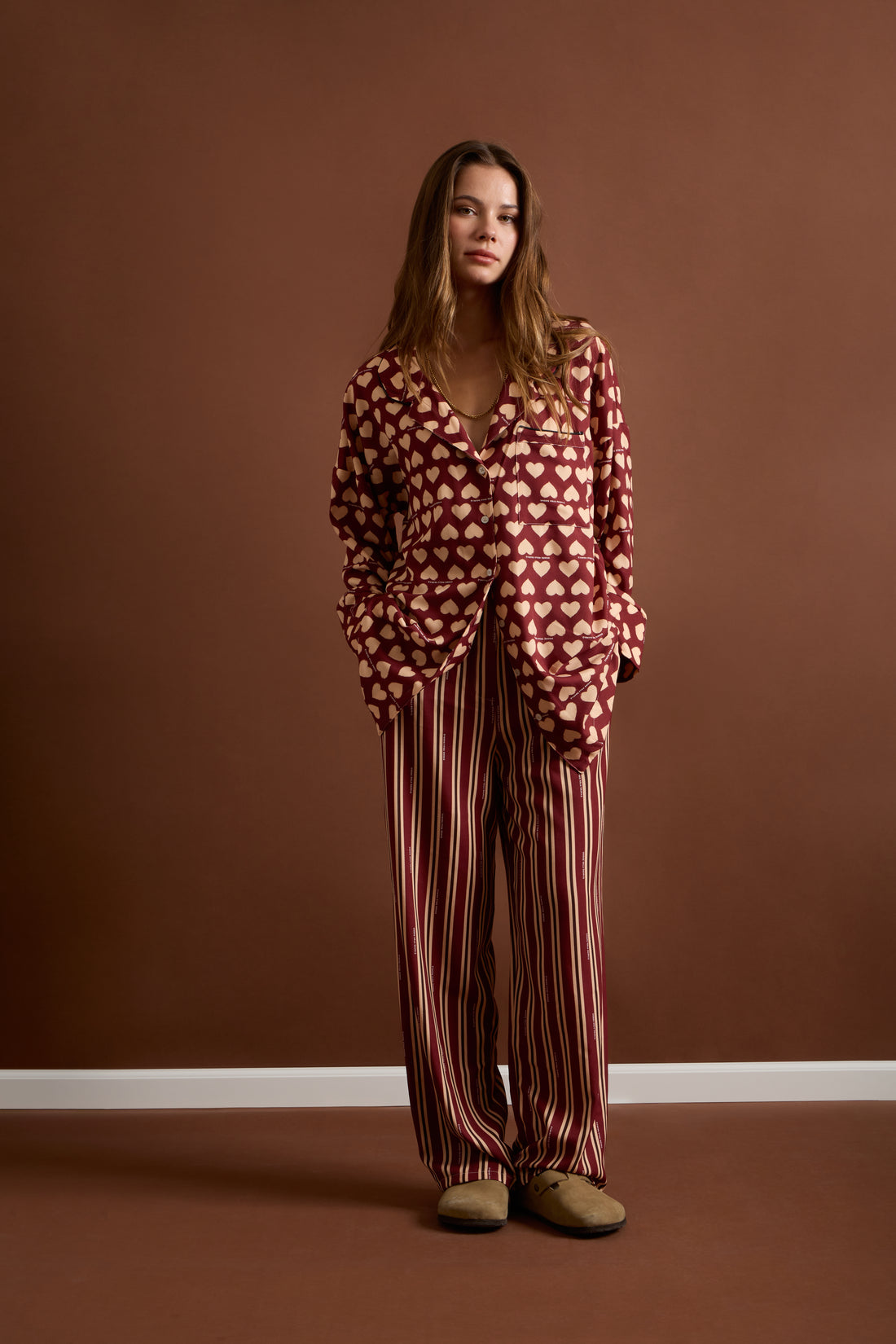 - High-impact stripes in matching burgundy palette