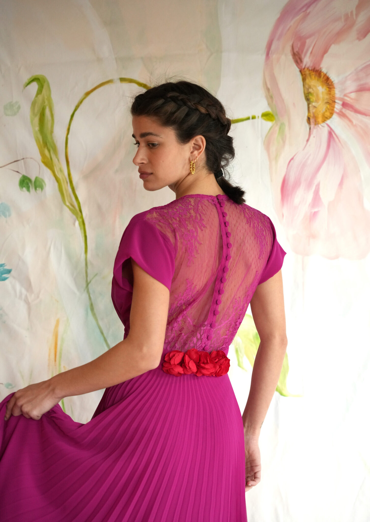 Η πλάτη είναι σχεδιασμένη δαντελένιες λεπτομέρειες και τα χαρακτηριστικά shoushou λουλούδια, δημιουργώντας μια κομψή και θηλυκή σιλουέτα.