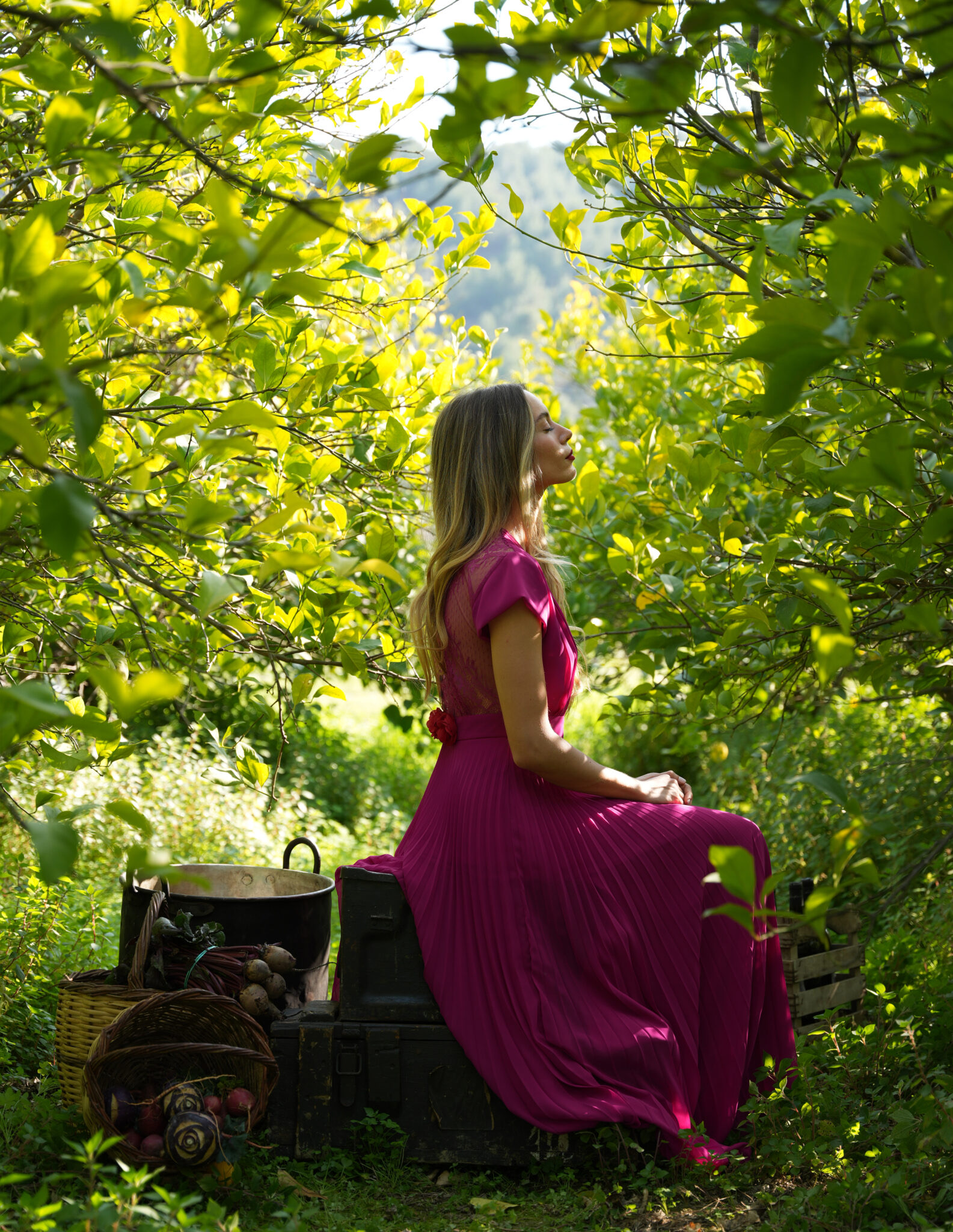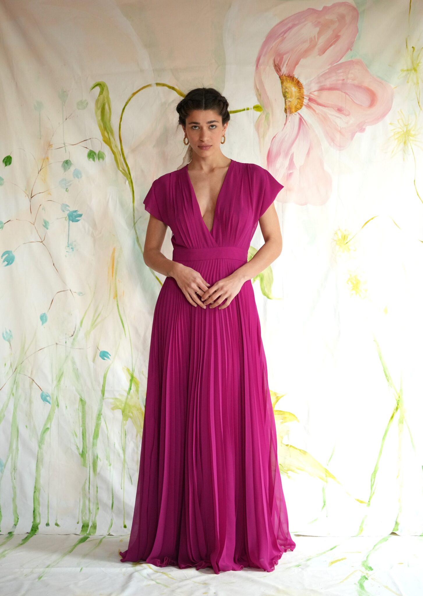 Μάξι φόρεμα με κοντά μανίκια και βαθύ ντεκολτέ σε σχήμα V, με πλισέ φούστα και εφαρμοστή μέση.