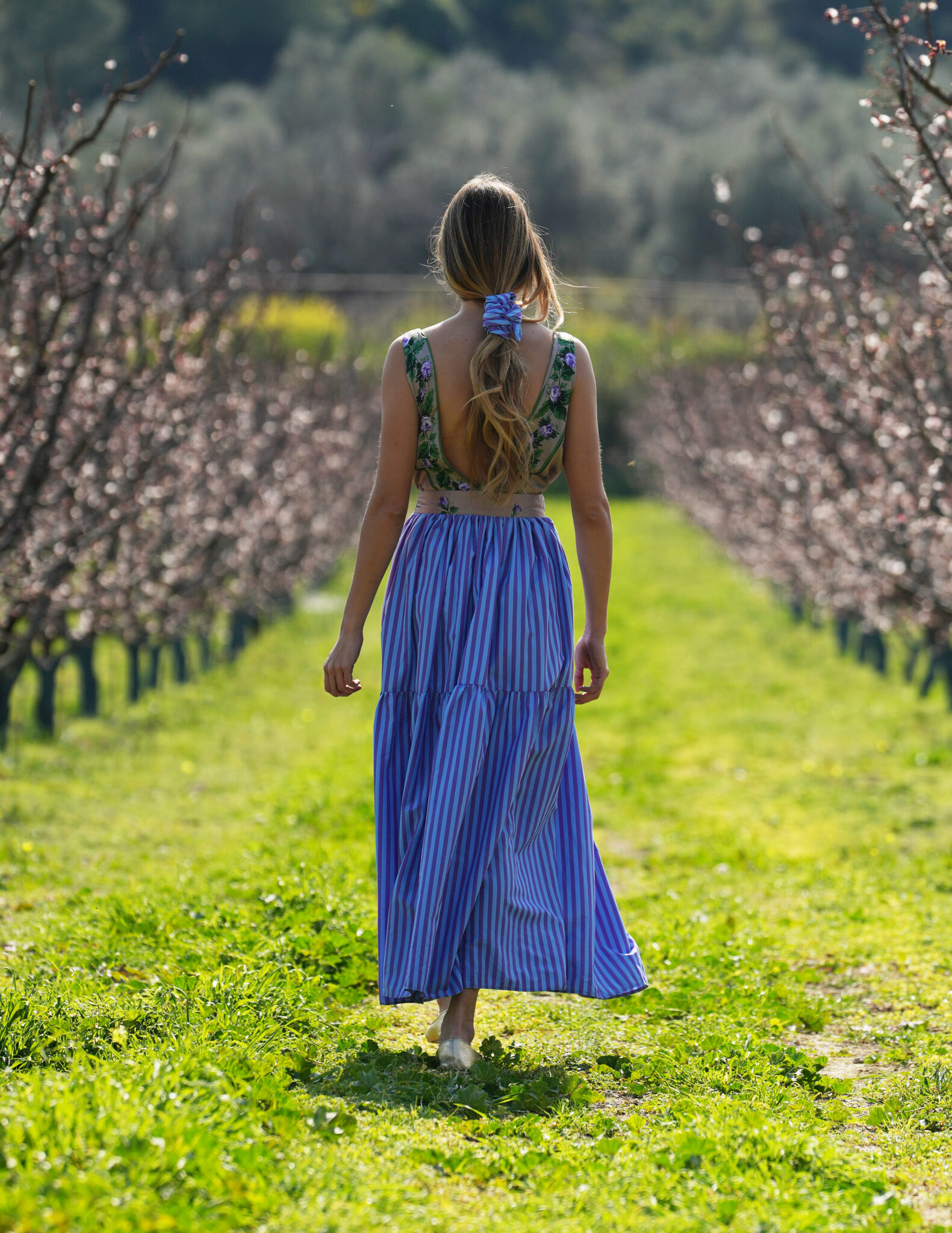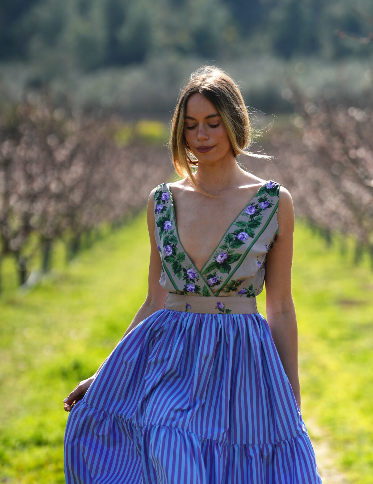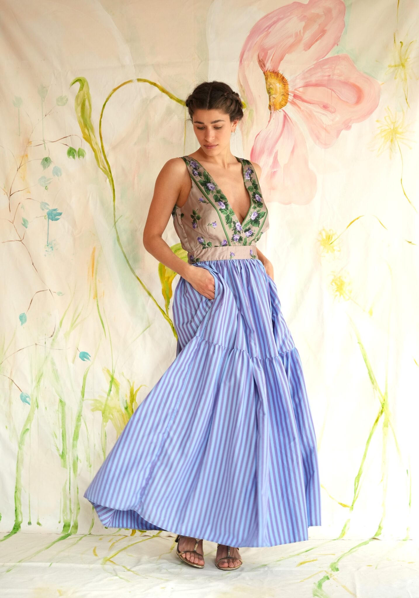 Μίντι φόρεμα με V floral λαιμόκοψη και ριγέ φούστα.