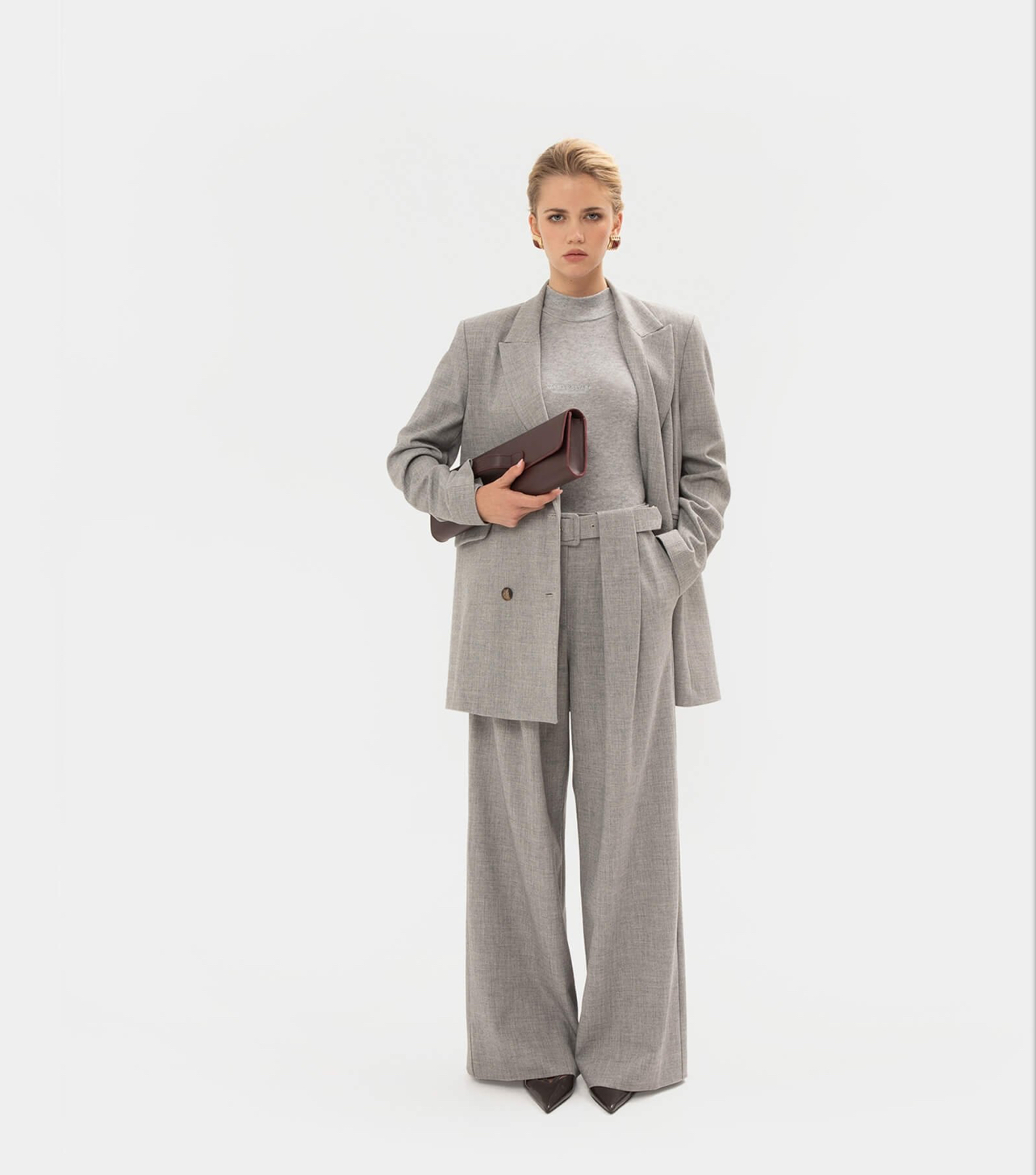 Classic grey pants with a tailored fit for a polished silhouette.