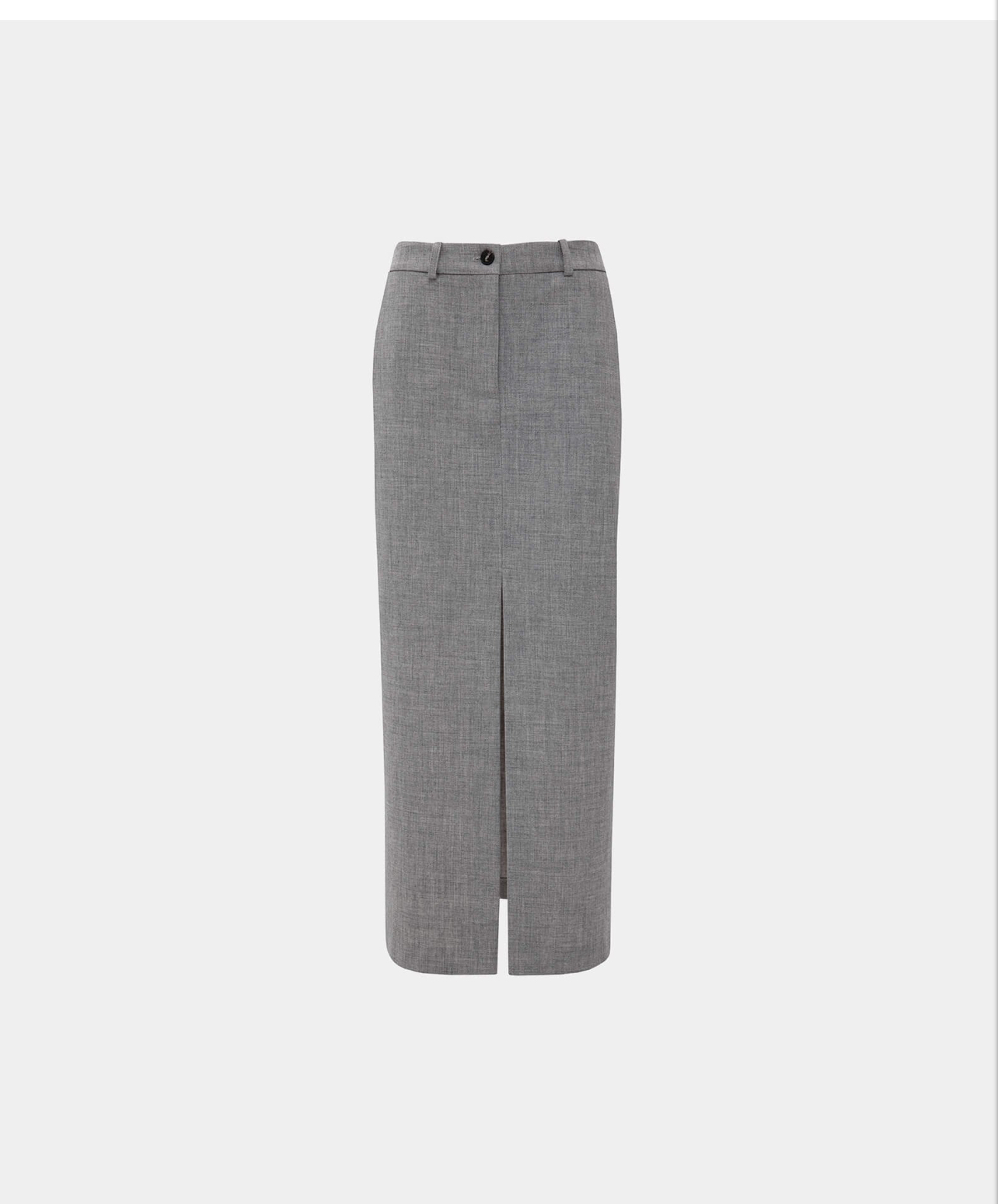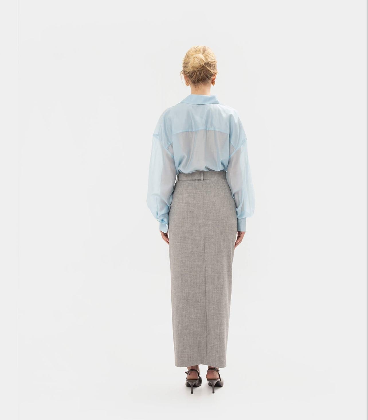 A sleek straight-line skirt in soft grey, balancing elegance and simplicity.