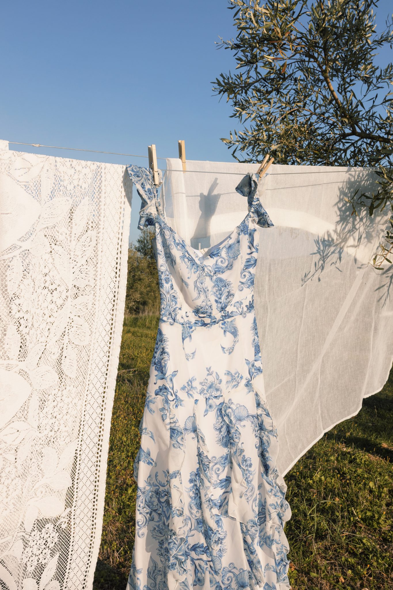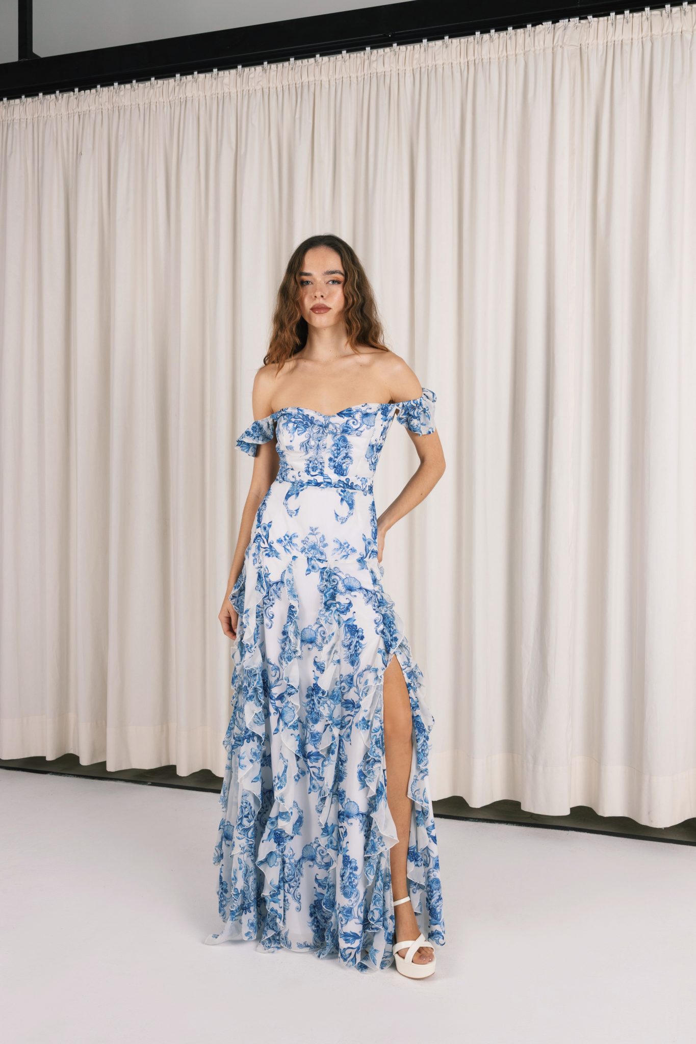 - Ρομαντικό maxi φόρεμα με εντυπωσιακό baroque μοτίβο σε λευκή βάση με μπλε λεπτομέρειες