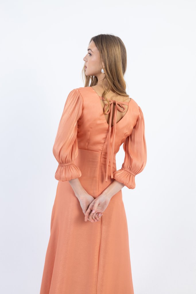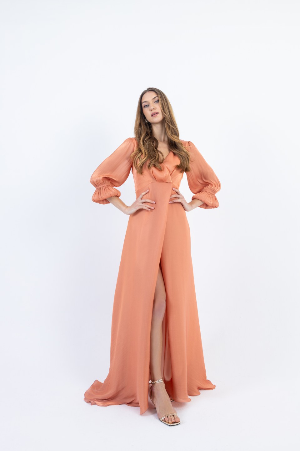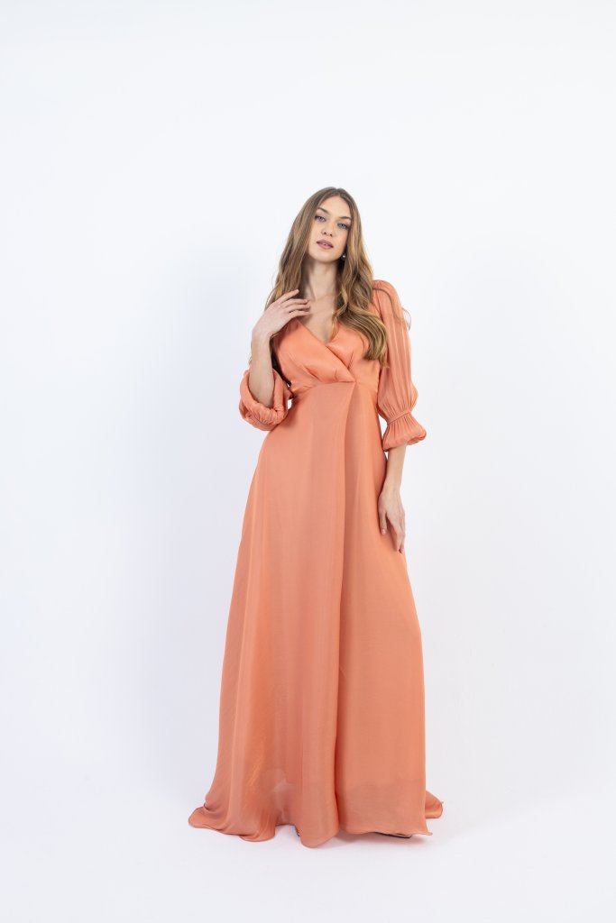 Ένα αέρινο και κομψό maxi φόρεμα σε μονόχρωμο πορτοκαλί χρώμα που αποπνέει φρεσκάδα και διαχρονική θηλυκότητα. Η απαλή αυτή πράσινη απόχρωση φωτίζει την επιδερμίδα και δημιουργεί ένα εκλεπτυσμένο αποτέλεσμα, ιδανικό για τις πιο ιδιαίτερες στιγμές της σεζόν.