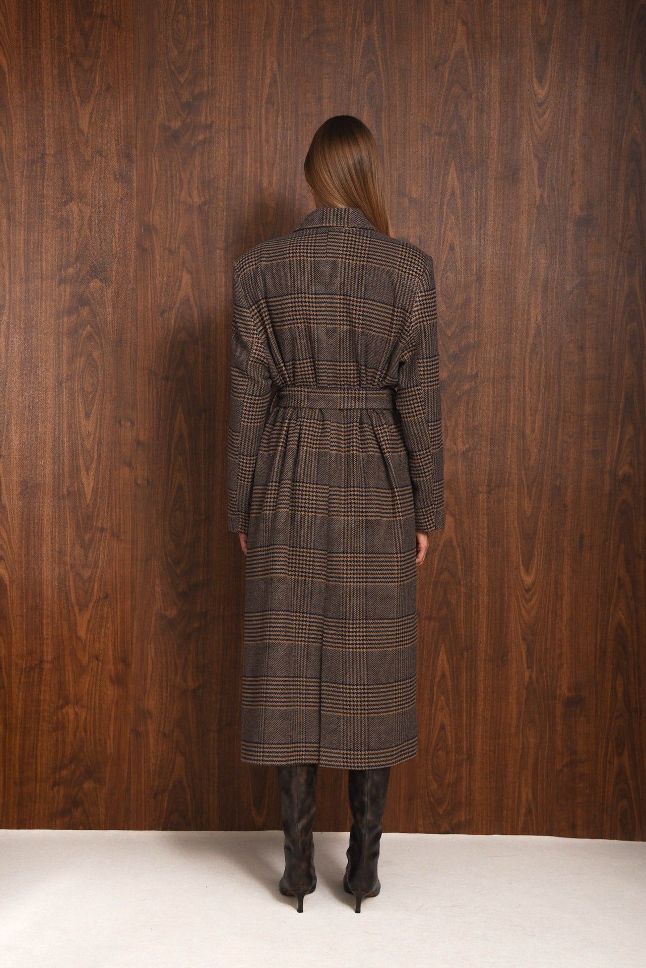 The Myself Coat is a long tailored piece featuring a classic blue plaid pattern. Designed with wide lapels, a single-button closure, and a matching belt that defines the waist. It includes front pockets and a straight cut for a refined silhouette. A timeless, structured coat that combines elegance and versatility for any season.