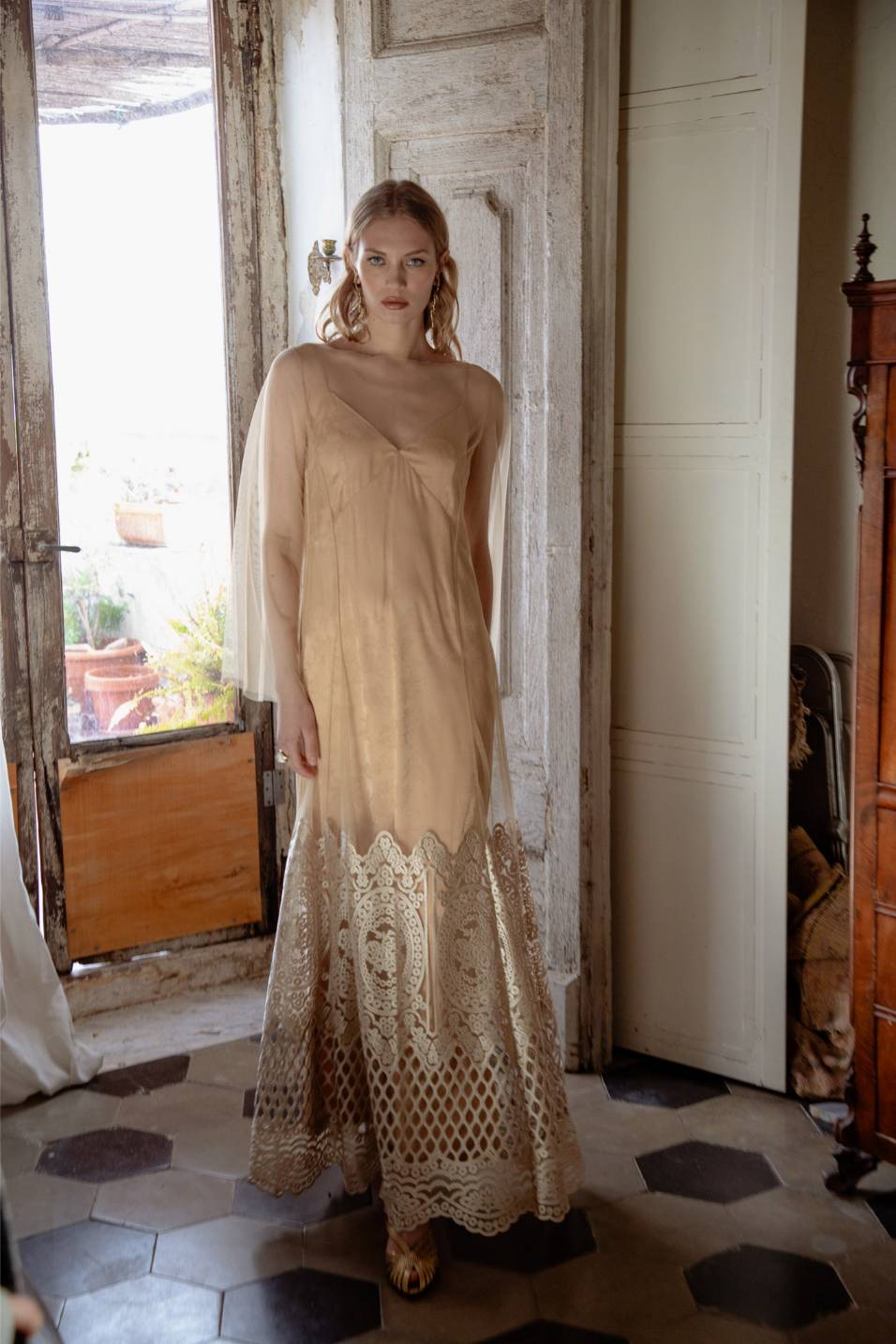 Φόρεμα με παγιέτα στο μπούστο και βολάν μπεζ