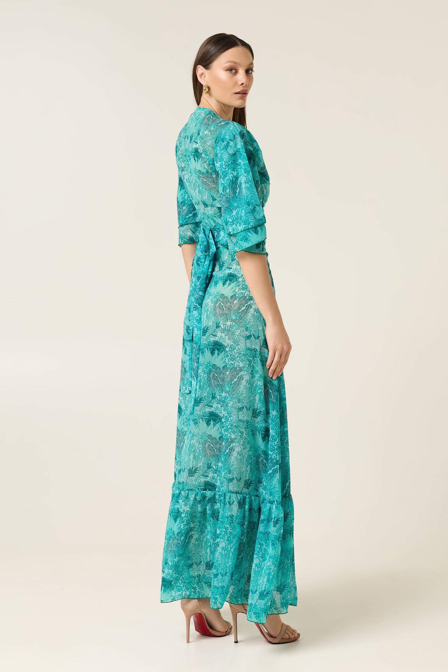 Το SERAFINA WRAP TOP της EVELEYA SS26αναδεικνύει τη σύγχρονη αισθητική μέσα από ένα εντυπωσιακό tropical floral pattern σε αποχρώσεις του τιρκουάζ.