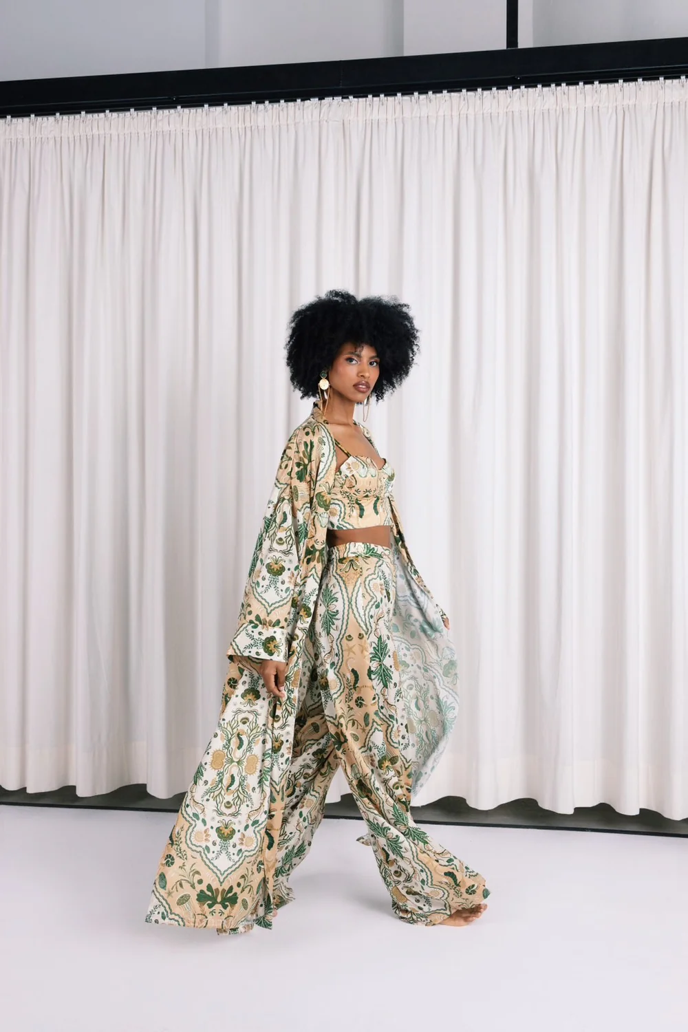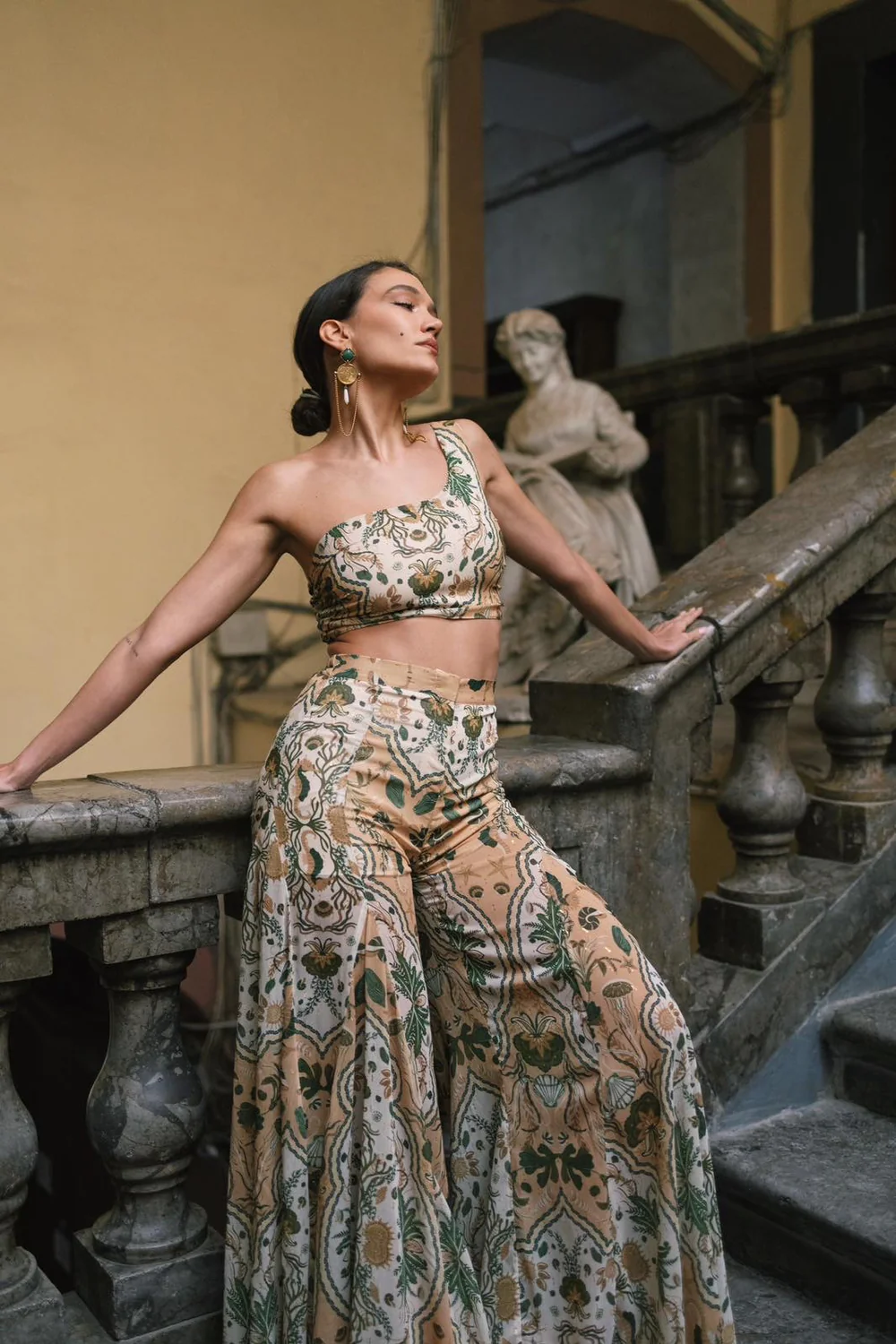 These high-waisted trousers offer a perfect balance of form and flow. Crafted from lightweight fabric with an all-over nature-inspired print, they feature a side zip and a discreet elastic panel at the back waistband — allowing for a smooth, flattering fit. Wear it solo or as part of a coordinated set to channel bold, effortless elegance.