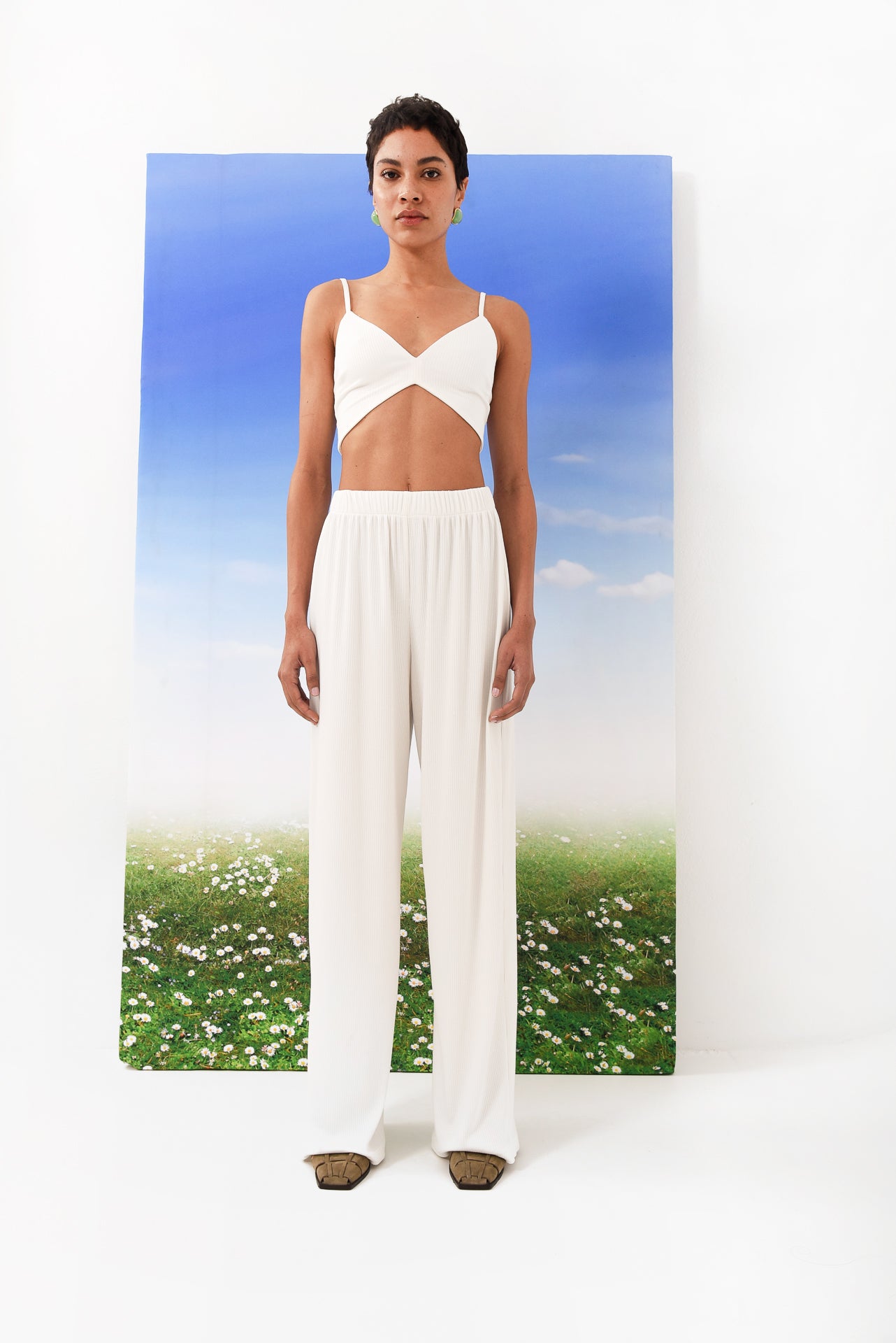 The Tanned Pants offer effortless comfort with a clean, relaxed silhouette. Designed in a soft ribbed fabric, they feature a high-rise elastic waistband and a wide-leg cut that drapes beautifully. Lightweight and easy to wear, they move fluidly with the body and pair perfectly with the matching Tanned Top & Bra for a coordinated look.
