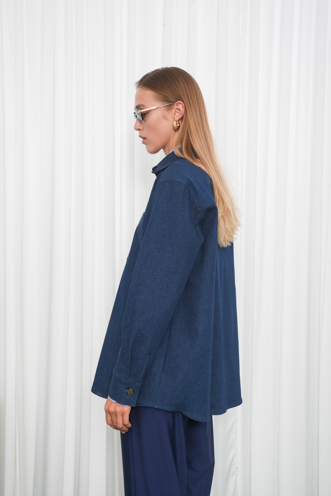 The Trust shirt is crafted in dark blue denim with a loose, boxy silhouette. Designed with a pointed collar, button closure, long sleeves with cuffs, and two chest pockets, it combines structure with comfort. Its versatile length makes it easy to wear buttoned up, layered, or open as a lightweight jacket.